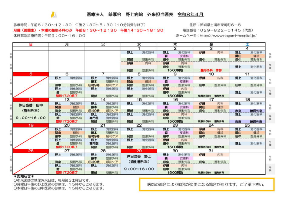 HOME > お知らせ > 4月の外来担当医表