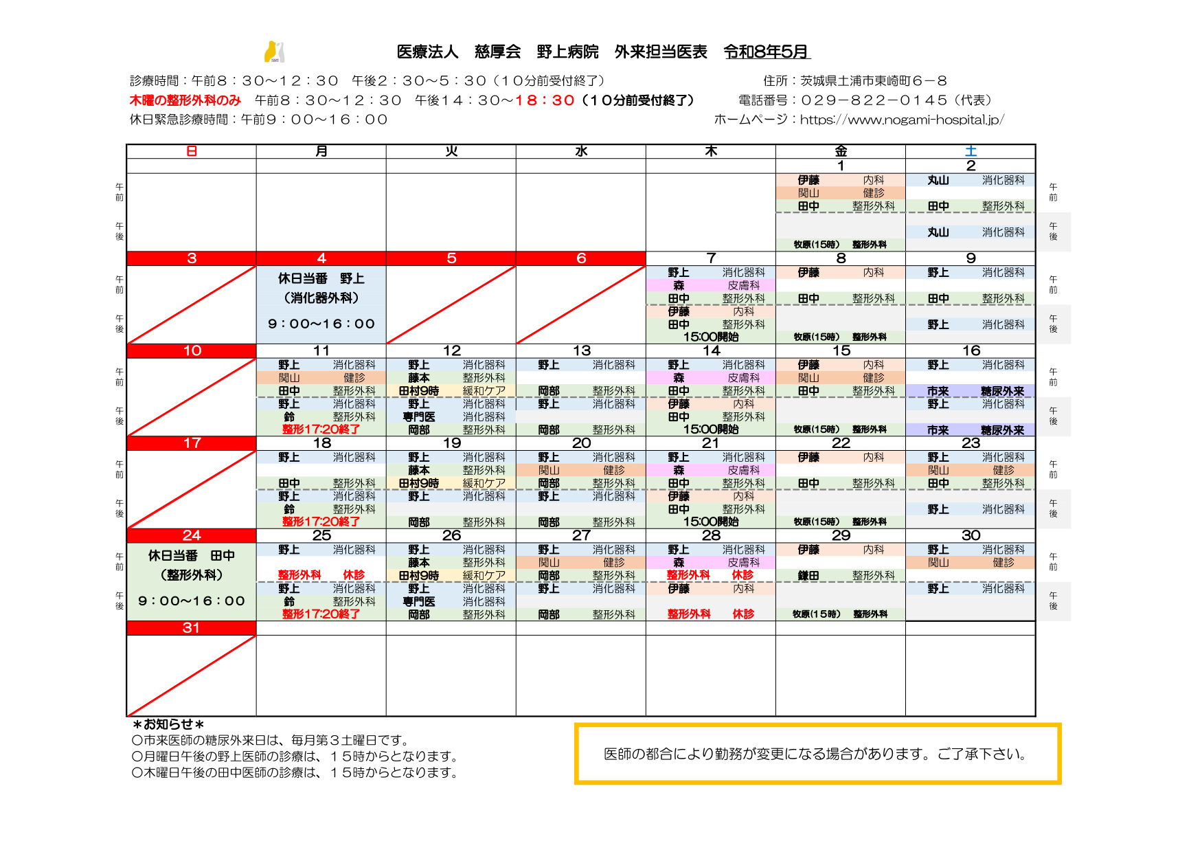 5月の外来担当医表